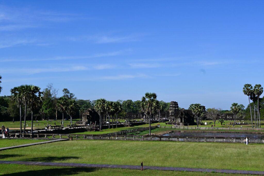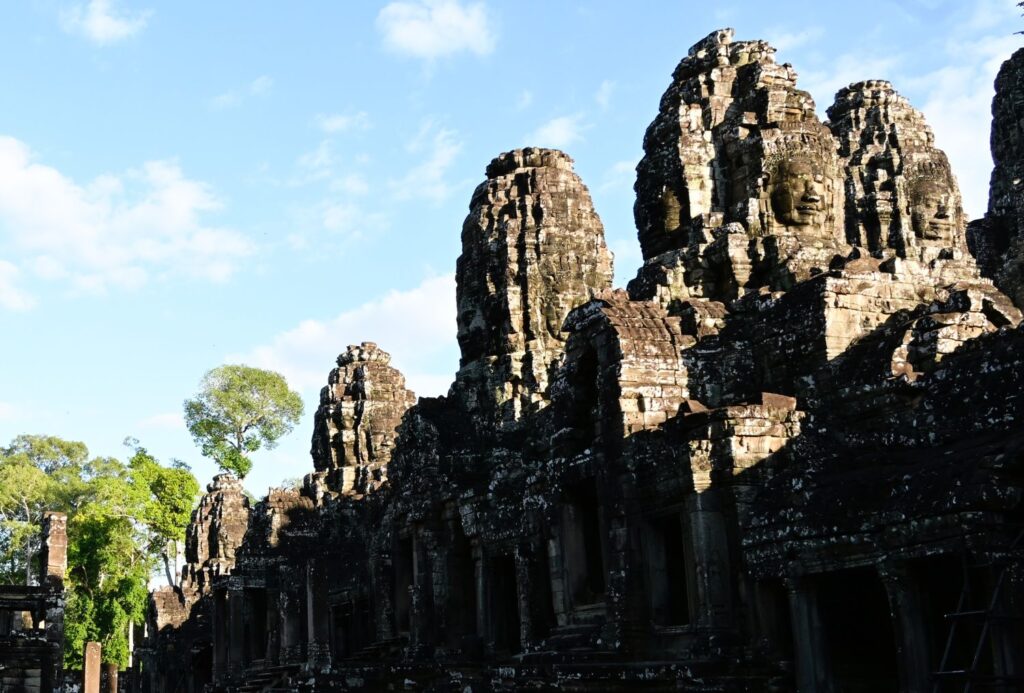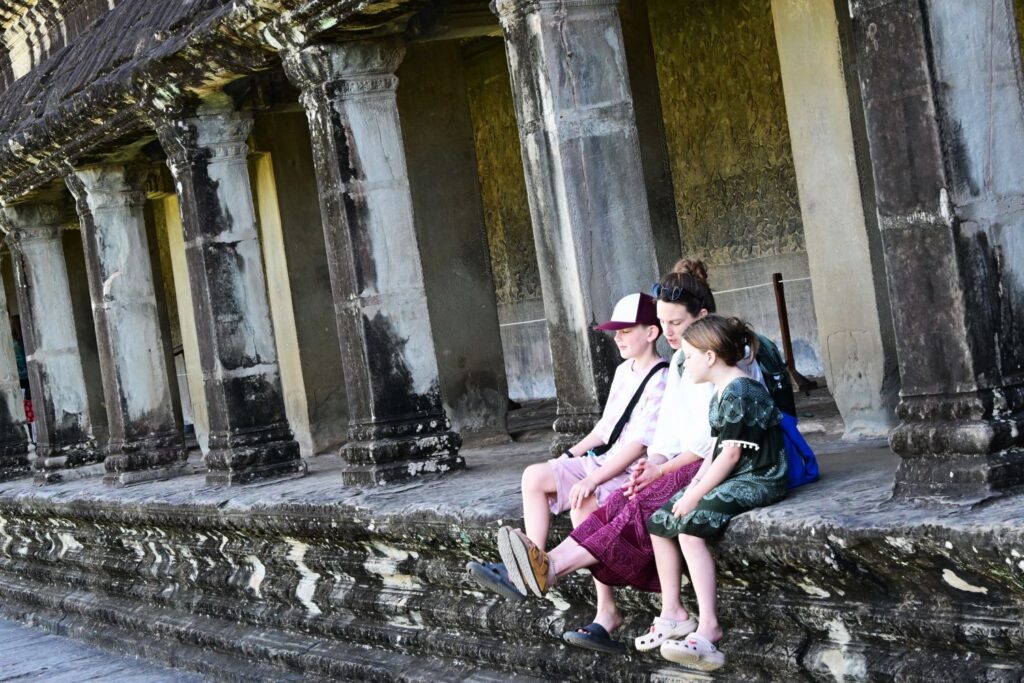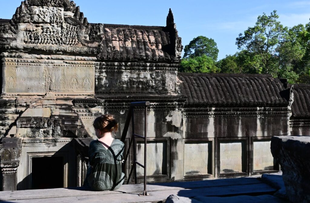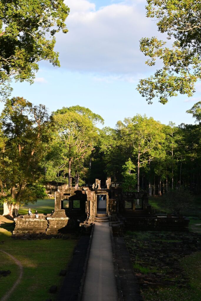 La troisième journée de visite des temples est dédiée à la grandeur, car nous débutons par Angkor Wat et son parc imposant. Entre l’afflux de touristes lambda, de mariés (oui oui) et d’instagrammeurs, il faut parfois slalomer. Je me pose quelques minutes à l’abri avec les enfants. Nous sommes admiratifs, mais pas charmés. Malgré les échafaudages et les travaux de réparation en cours, nous nous montrons plus sensibles à la beauté de l’emblématique Bayon et ses visages de pierre. D’autant plus qu’il se trouve en plein cœur de l’ancienne cité royale d’Angkor Thom et de son atmosphère envoûtante. Après un parcours global plutôt discipliné, nous partons en freestyle. Comme si la fin de la validité de notre pass d’accès aux temples avait déclenché une sauvagerie soudaine, nous sautons sur nos montures et nous dirigeons n’importe où, fiévreusement, empruntant des chemins oubliés. C’est ainsi que nous débouchons sur un temple aussi isolé que ravissant. Le dernier de la série, que nous baptiserons : la cerise sur le gâteau.