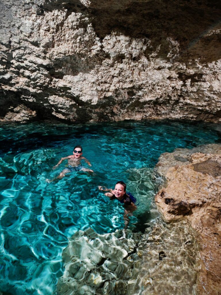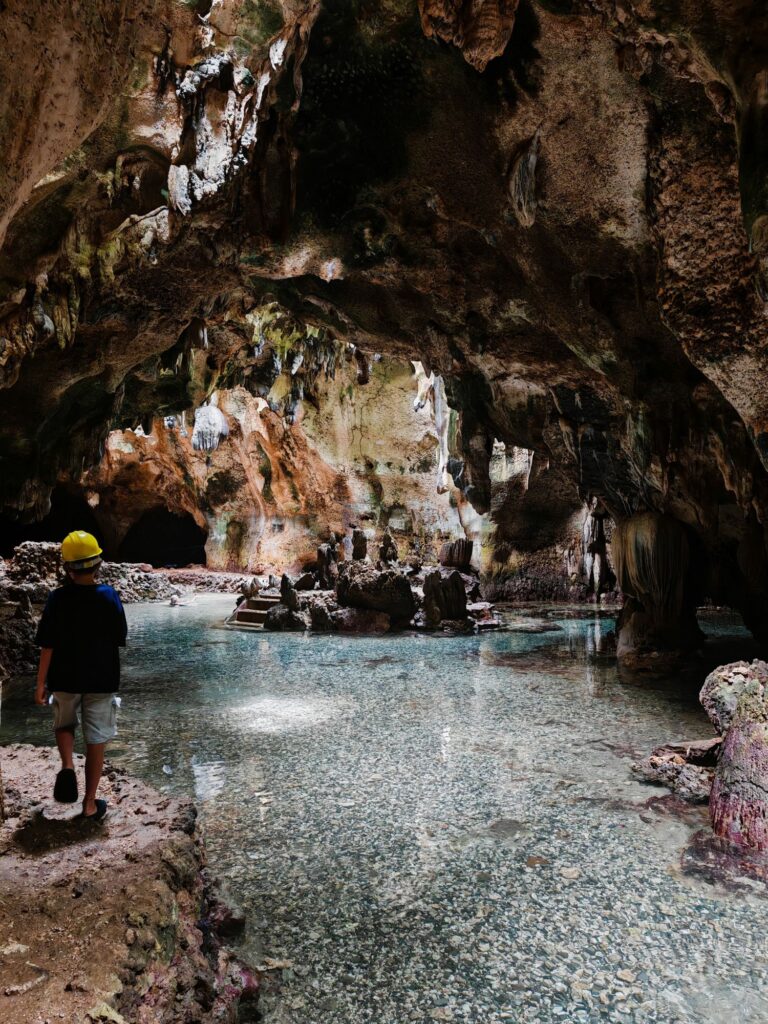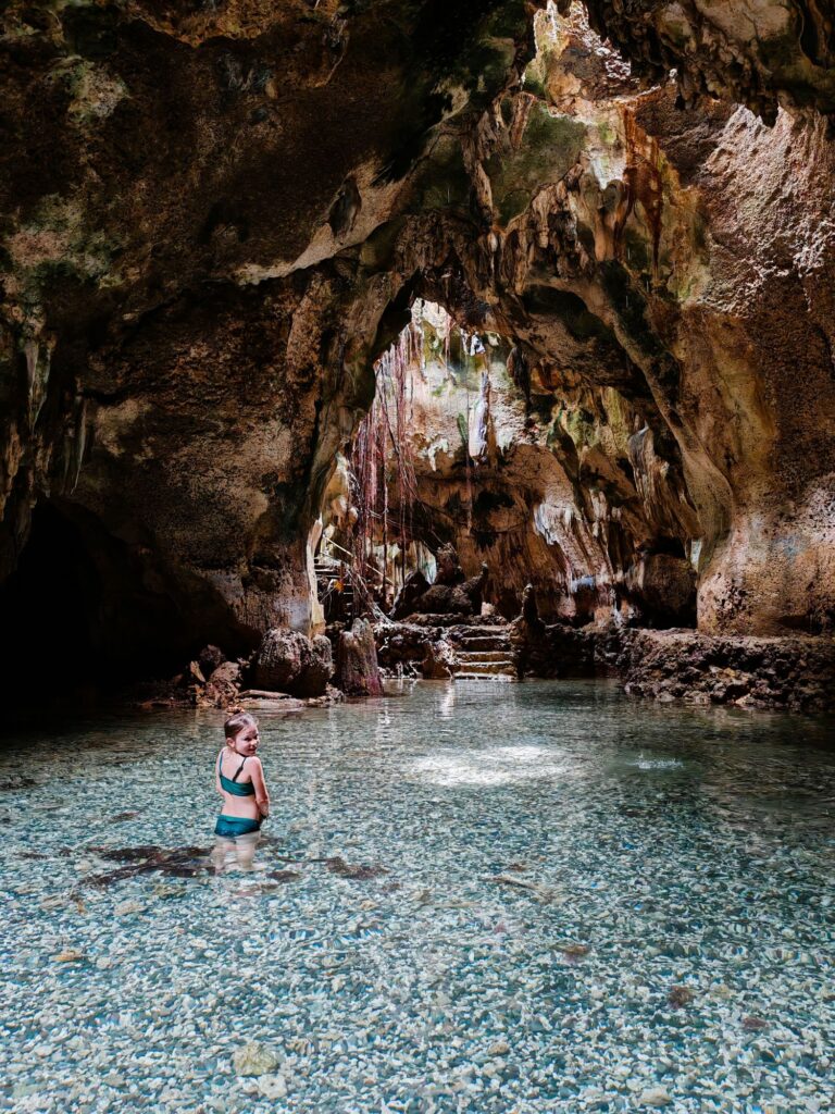 Nous écumons les grottes, où la baignade est possible. Une parade ingénieuse à une météo parfois incertaine. La petite Paraiso a son charme, malgré la chaleur viciée des profondeurs. L’air est plus respirable à Bukilat, qui jouit de puits de lumière naturelle et d’un décor lunaire. Seuls ceux qui ne redoutent pas les excréments de chauves-souris font trempette. Mia, en l’occurrence.
