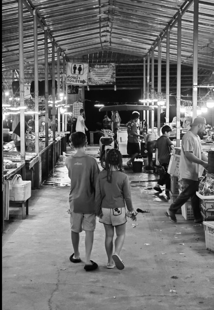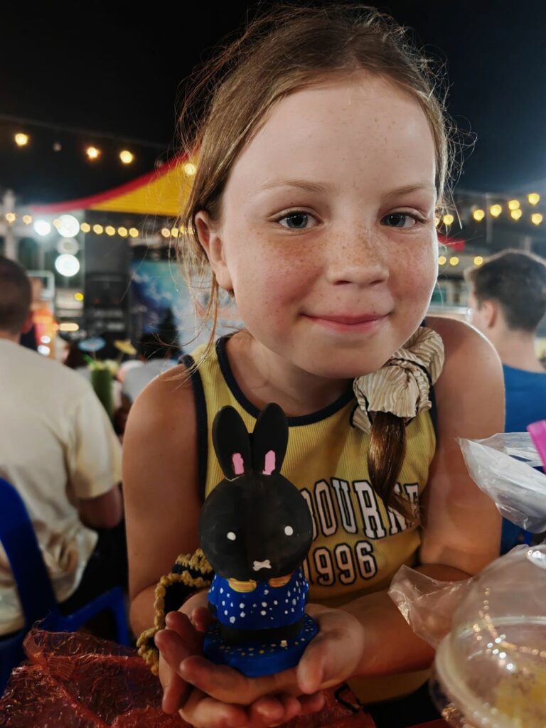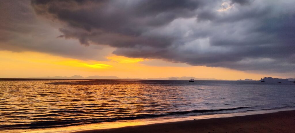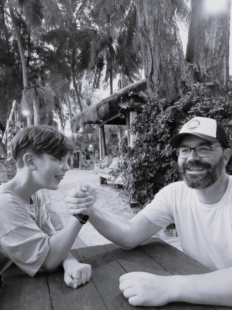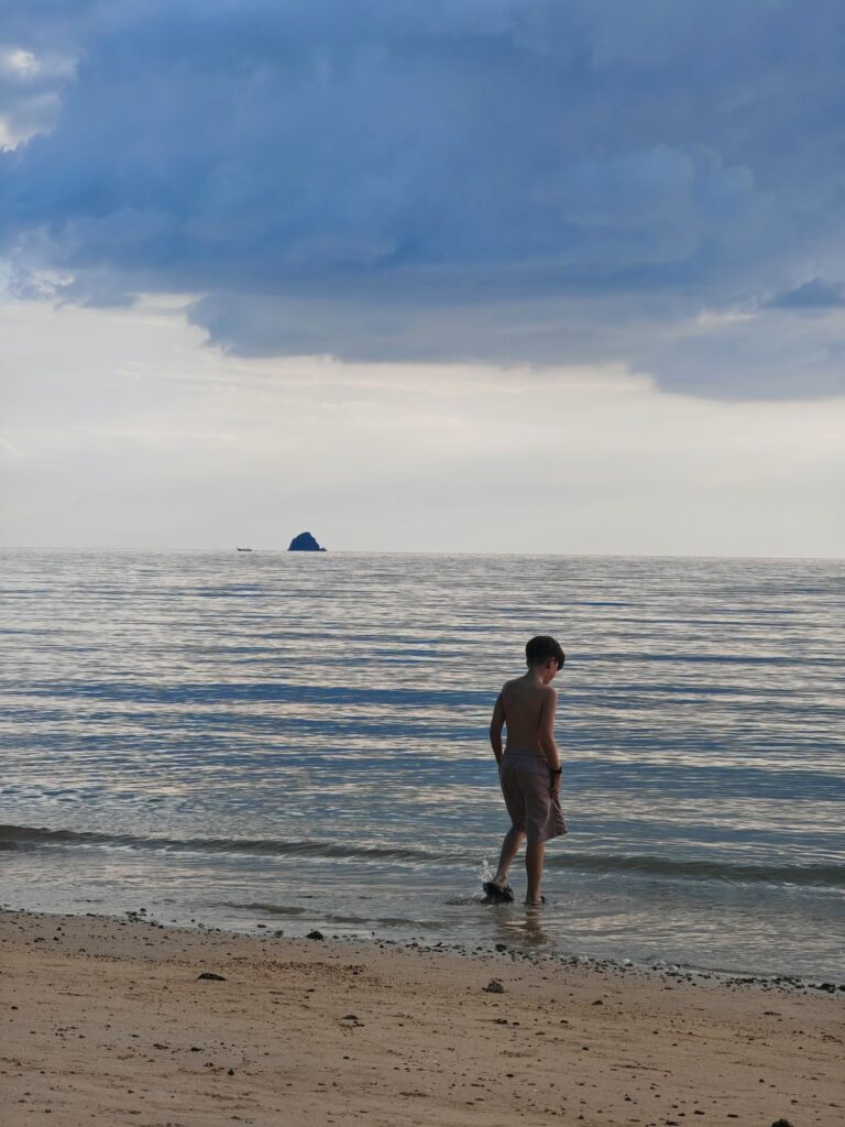 C’est si agréable de retrouver la famille dans un pays exotique. Nous partageons du temps de qualité dans un décor de rêve, sur la plage. Situé à une cinquantaine de kilomètres de Phuket, l’hôtel est confortable et le contexte idéal pour se mettre en pause durant quelques jours. Les enfants passent l’essentiel de leur temps à se baigner. Cette année, Saint-Nicolas n’a pas vraiment déposé de cadeaux dans les pantoufles, mais il aura apporté la mer. Le soir, nous mangeons dans des cahutes sur la plage. Tandis que les autres se gavent de poulet-noix de cajou et de mango sticky rice, je risque les fruits de mer. Grâce au gonflement des troupes, les parties de UNO s’allongent considérablement. Sai nous dévoile son fanatisme pour les noix de coco, dont elle contamine sa nièce. Mia en adopte une, la trimballant partout comme une poupée en la baptisant successivement Roberte, puis Nilson. Lorsqu’elle lui dessine un visage, il apparaît clairement que les similitudes avec le film Seul au monde ne sont pas fortuites. En fin de journée, Rémi épie le ciel pour capturer les plus beaux couchers de soleil. Ceux qui ont vécu l’Asie ne peuvent que se souvenir de cette lumière si particulière.