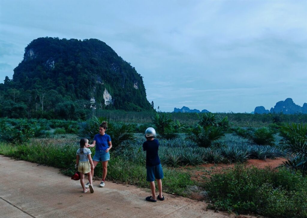 Pour la deuxième partie du séjour thaï, nous rejoignons la province de Krabi. Rémi et Sai emmènent leur nièce en excursion en bateau et s’aventurent sur Railay beach, dont la beauté est largement entachée par le tourisme de masse. Face à ce fléau, le scooter reste notre meilleure échappatoire. Avec Yann, qui se trouve à l’arrière de Ben, nous avons développé un véritable langage des signes, doublé d’un code de klaxons. Sa principale mission est de vérifier que je suis toujours derrière eux, n’ayant aucune technique de guidage à ma disposition. Quelques ratés occasionnels (que j’ose espérer non intentionnels) m’ont incitée à enclencher un sitting, jusqu’à ce qu’on daigne se rendre compte de ma disparition et qu’on vienne me rechercher. Lors de l’une de nos explorations, nous nous enfonçons dans la campagne et tombons sur une ananeraie. Pour mon plus grand bonheur, nous nous perdons dans les nuances de verts et de bleus. Si bien que la petite route devient un chemin, le chemin devient un sentier, le sentier disparaît… et nous sommes perdus, cette fois pour de bon! On arrive au stade où Ben commence à rire, alors que moi, je ne ris plus. Autour de nous, la noirceur s’épaissit. Les rochers karstiques projettent des ombres menaçantes. Je nous imagine déjà déchiquetés par des animaux sauvages, malheureux protagonistes d’un fait divers sordide. Un simple demi-tour nous épargne ce destin tragique.