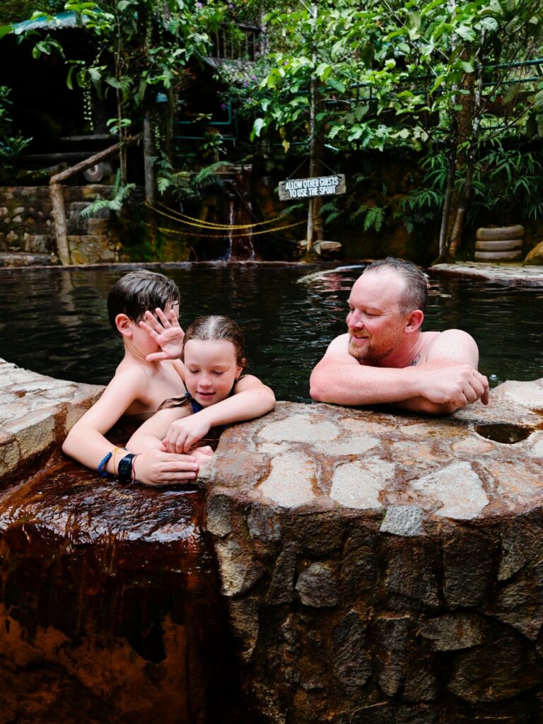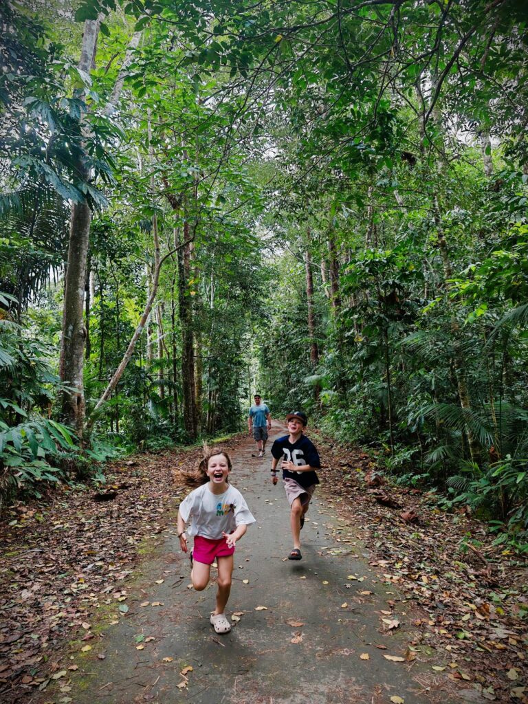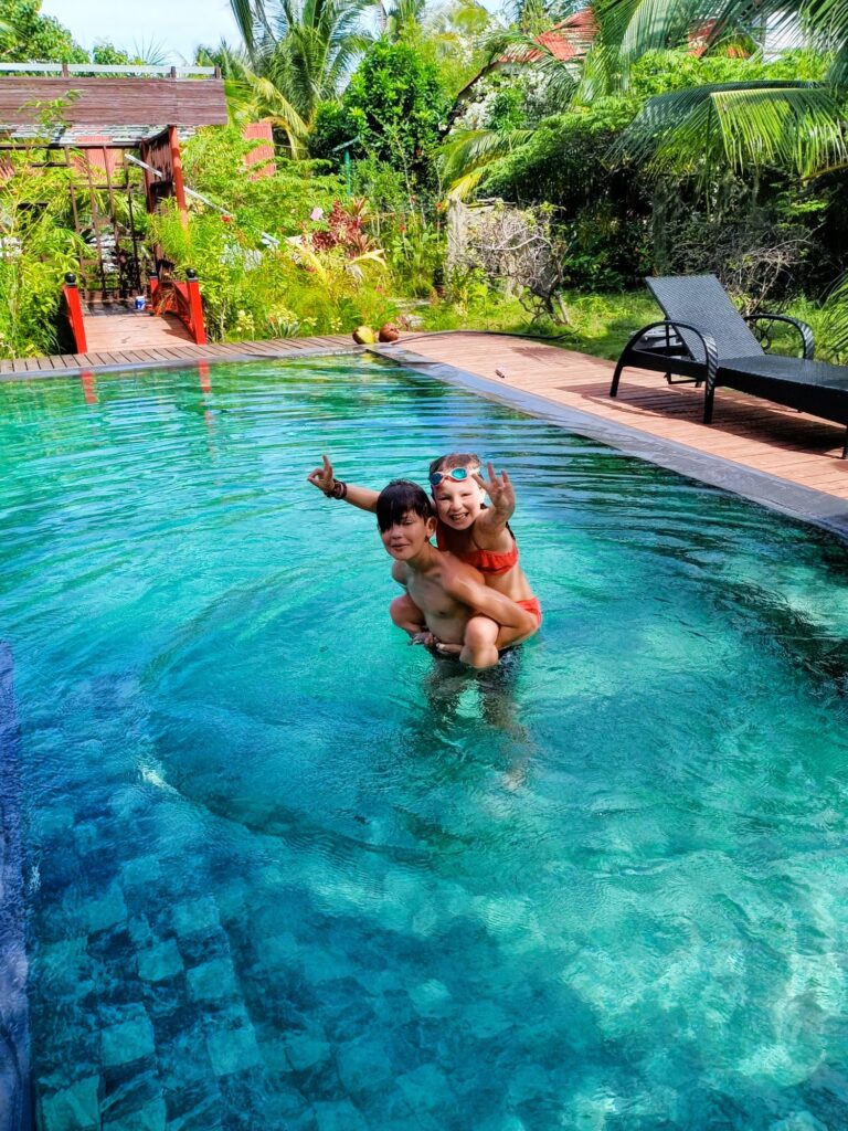 Au café Molmol, situé au Nord de l’île, les propriétaires français nous réservent un accueil chaleureux. Nous trouvons refuge au fond d’un jardin arboré, dans une petite maison traditionnelle en bambou. La piscine en pierres de Bali réamorce des projets rangés au placard. L’absence d’eau chaude, plutôt que de constituer un bémol, se transforme en réjouissance pour les enfants. On fait chauffer la bouilloire à l’heure du bain. Ils trouvent ça « absolument génial! » de se laver à la casserole. Même les araignées énormes qui s’infiltrent par les interstices du plancher n’entachent pas leur enthousiasme. Je m’auto-persuade qu’elles ne grimpent pas sur les lits.